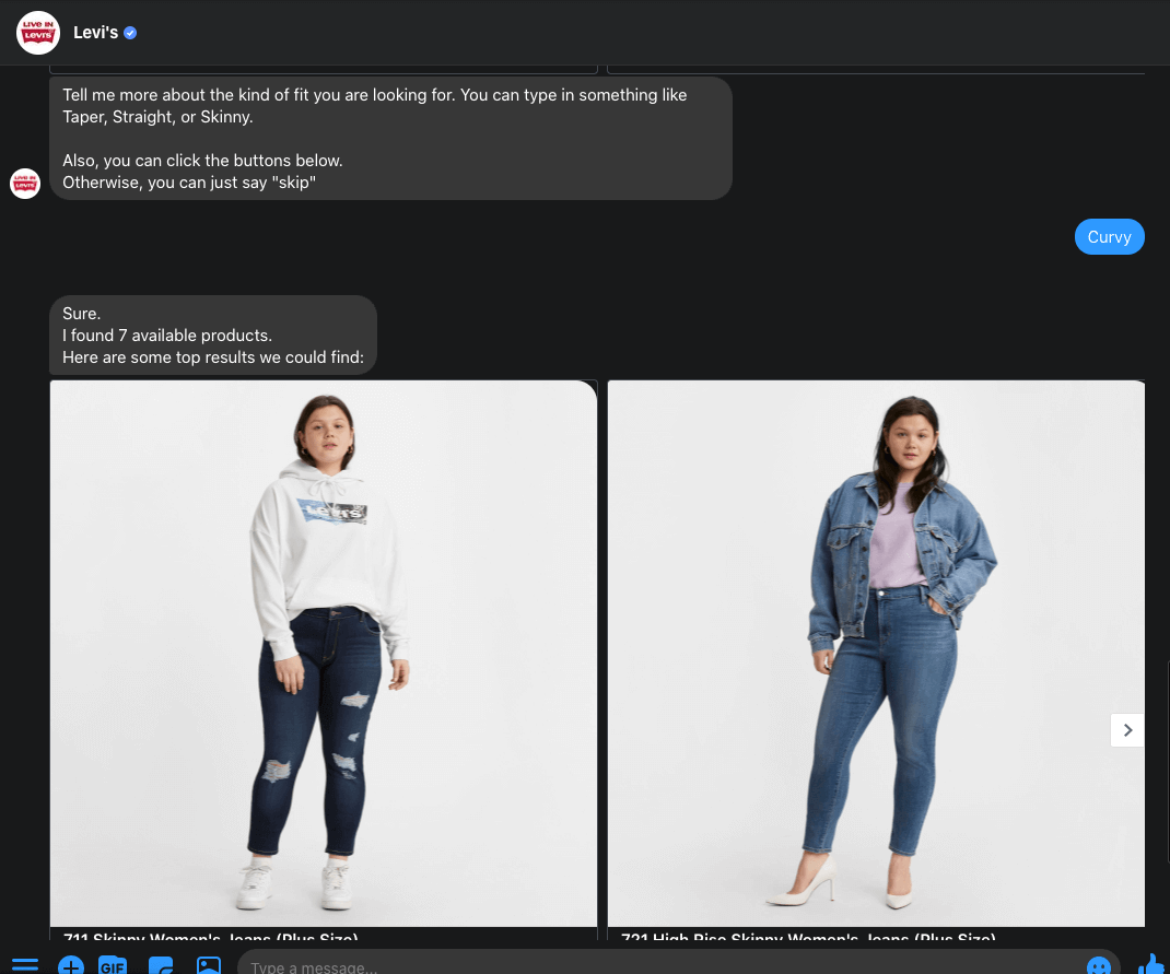 Trong ví dụ trên, từ Levi’s , chatbot Trợ lý ảo của họ giúp người dùng chọn một chiếc quần jean hoàn hảo.