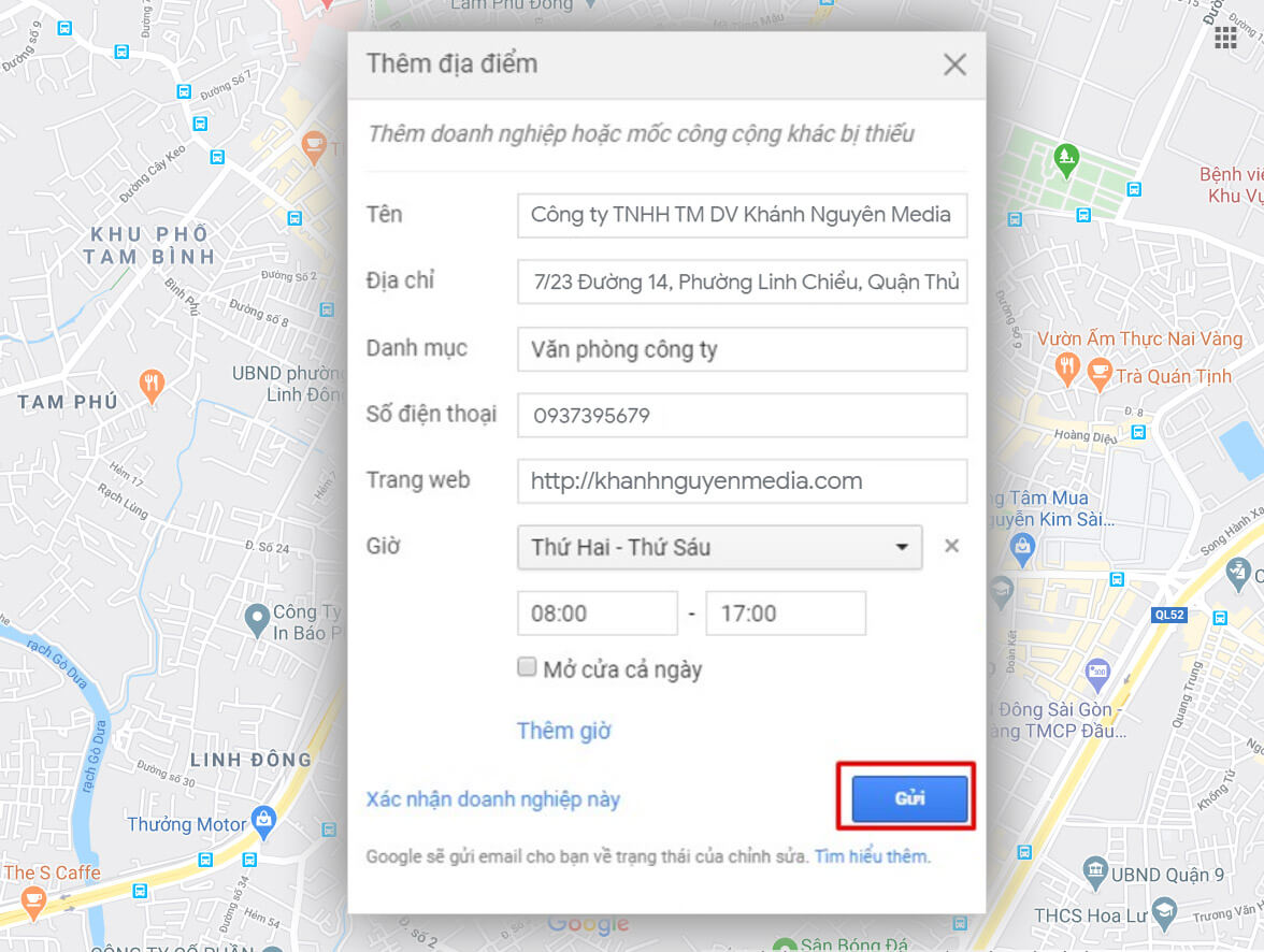 Đây là bước quan trọng, các bạn cần nhập thông tin chính xác, và lưu thông tin này để dùng cho bước SEO google map lên top. Các thông tin cần nhập gồm: