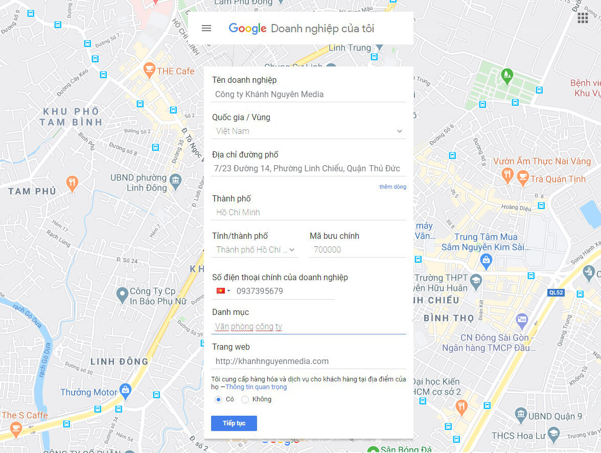 VD: Công ty Khánh Nguyên Media ở số 5 Đường 14, P. Linh Chiểu, Q. Thủ Đức, TP.HCM, thì các bạn nhập như hình trên.