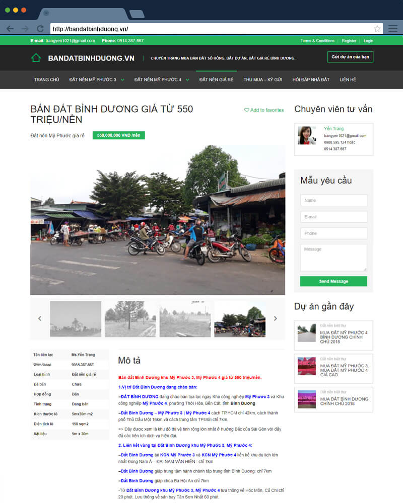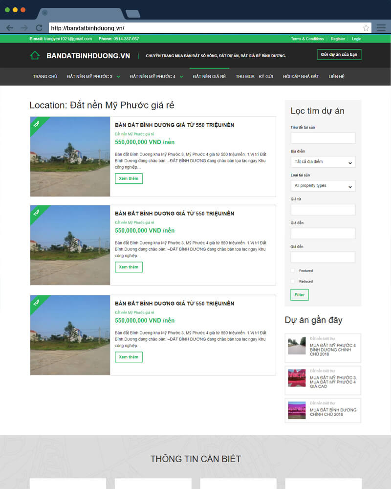 Dự án website mua bán Bất Động Sản Bình Dương, khách hàng có thể tham khảo để xem tính năng của nó. Ngoài ra bố cục và sự hiển thị thì khách hàng có thể yêu cầu chúng tôi, đáp ứng theo yêu cầu của doanh nghiệp bạn cho hợp lý.